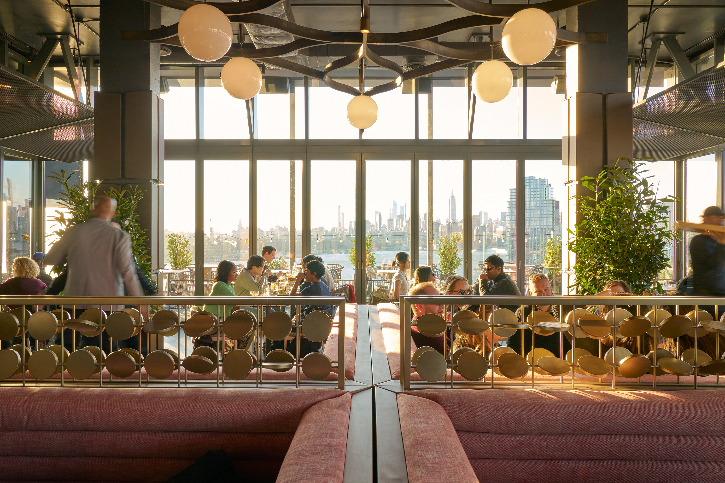 Expansive views of Brooklyn and Manhattan surround Westlight with its floor-to-ceiling windows that encircle the central bar and lounge. Designed by Studio Munge, the interior features black-and- white tiled floors, modern banquet seating in soft greys with pops of yellow, brass accents and a honed stone bar with metal mesh shelving. Westlight’s mixture of lounge and high-top seating accommodates up to 90 guests indoors, and up to 110 with usage of the wrap-around outdoor terrace.